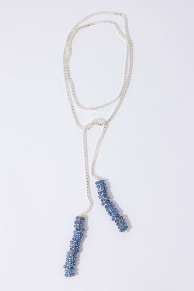 Et kult statement-smykke laget av glitrende blå Rondelle-krystaller kombinert med en sølvbelagt messingkjede.