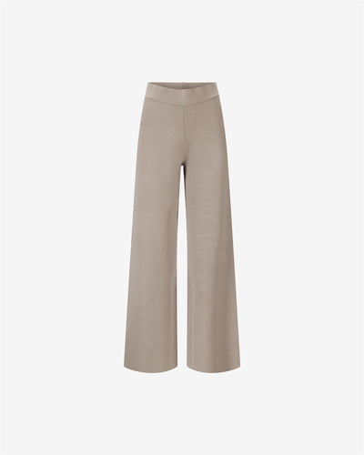 Buksene har en elastisk, bred linning for perfekt passform, en flatterende midjehøyde og en myk ribbestrikket tekstur. Buksens vide ben og ankellange design gir allsidighet og et moderne uttrykk. Buksene er praktiske å trekke på, og er perfekte for bruk hele dagen.
