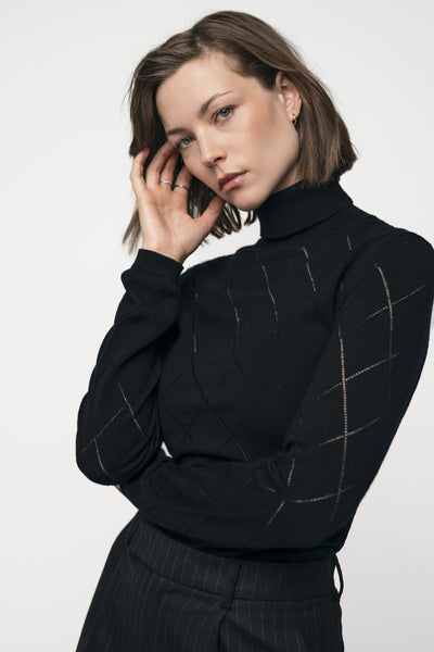 En behagelig turtleneck i merinoull med delikat argyle-punktstrikk. Tao er designet for en slank silhuett som passer perfekt til kroppen, og er både klassisk og moderne. Myk, pustende og uendelig allsidig – bruk den under skreddersydde plagg, stappet inn i bukser med høy midje eller kombinert med jeans for en uformell stil. En tidløs strikk med en subtil kant, klar til å løfte din daglige garderobe.