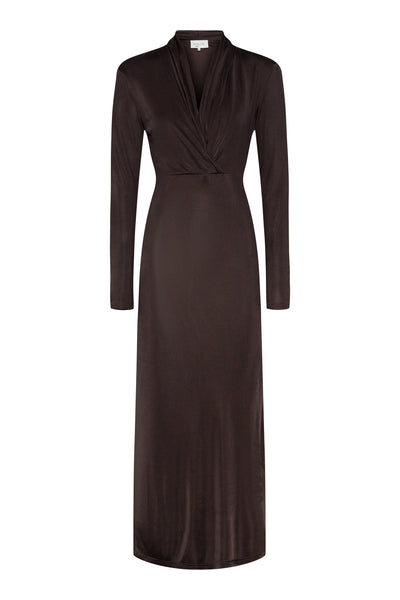 Midnight-kjolen er en fantastisk maxikjole i en rik brun fargetone. Kjolen har en oval åpning foran med elegant drapering, skulderputer og lange, smale ermer som gir en sofistikert silhuett. Den definerte midjen fremhever figuren din, noe som gjør den til et perfekt valg for bryllupsgjester, fester eller gallaarrangementer.