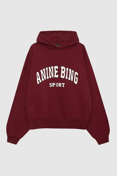 Alec Hoodie Sport er et uunnværlig fritidsplagg laget av mellomtung bomullsfleece i en dyp rød farge. Den har en ANINE BING Sport chenille-patchgrafikk i elfenbensfarget collegebokstaver med svart broderi foran.