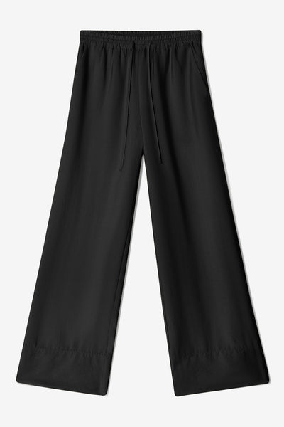 En luftig bukse med vide ben, strikk i livet med justerbar knyting, lommer i sidene.