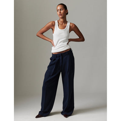 Denne buksen med vidde og høy passform har folder i midjen, glidelås med hakelås og sidelommer. Det er en enkelt påsydd lomme bak. Buksen har en normal passform.