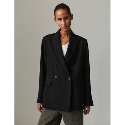 Denne dobbeltradede blazeren har spisse revers, knapper ved håndleddene og polstrede skuldre. Den har påsydde lommer foran, en lomme på brystet og en innerlomme. Blazeren er helfôret og har normal passform.