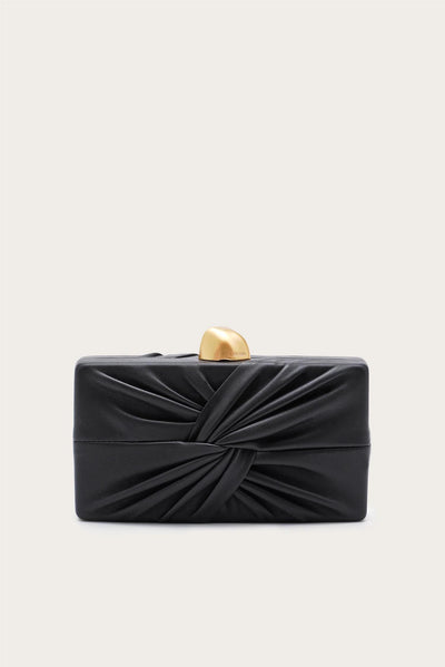 En sofistikert clutch med abstrakt gullspenne og knutede lærdetaljer.