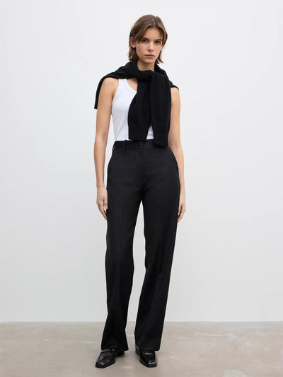Middels høye, skreddersydde og klassiske dressbukser laget av lett ullstoff med rett ben, pressede bretter, skrålommer foran og baklommer med kant.