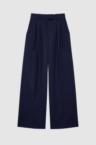 Lou-buksen er laget av et mellomtykt, strukturert ullmateriale med et lett fall. Den overdimensjonerte silhuetten har en skreddersydd konstruksjon med doble plisseringer, en forlenget flik og glidelåslukking foran og en paspellomme bak. Buksen har et ultrabredt ben som strekker seg fra låret og ned til en lang innersøm.