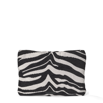 En kompakt veske i jacquardvevd sebramønster, perfekt for små gjenstander. Den har en innfelt glidelås og en fast form, med et lett twillfôr og en innerlomme med glidelås. En funksjonell og dekorativ løsning som kan brukes både i større vesker eller separat.