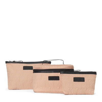 Dette settet består av tre toalettmapper i ulike størrelser, designet i quiltet musselinmønster. Den store modellen har to innvendige åpne lommer. Boksen har fire innvendige åpne lommer med elastiske kanter og en lomme med glidelås. Et bærehåndtak gjør den enkel å bære rundt, og settet er perfekt for å holde orden, både hjemme og på reise. Ytterstoffet og innerforet på veskene er laget av 100 % sertifisert resirkulert materiale.