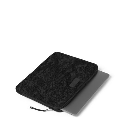 En chenille-laptopveske med glidelås og en ekstra innerlomme for dokumenter eller småting. Designet for å passe til en 13-tommers laptop og enkel å ha med i hverdagsvesken.