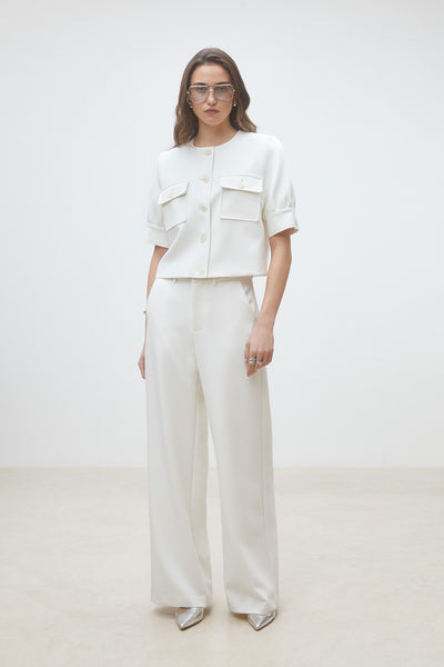 Elegante dressbukser med vide ben og et rent, sofistikert uttrykk. Modellen har en flatterende passform med høyt liv og en minimalistisk front som gir et moderne og tidløst preg. Perfekt både til jobb og mer pyntede anledninger.