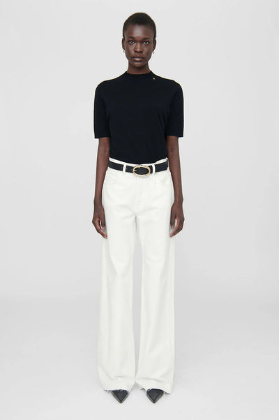 Bestselgende Hugh Jean fra Anine Bing er en avslappet, 90-tallsinspirert jeans med høyt liv, vide og lange ben samt råkant nederst. Laget i en stiv økologisk bomullsblanding uten stretch i en klassisk hvit vask med vintageinspirert sliping, håndsliping og høye og lave kanter. Modellen er en klassisk 5-lommes jeans med knappelukking.