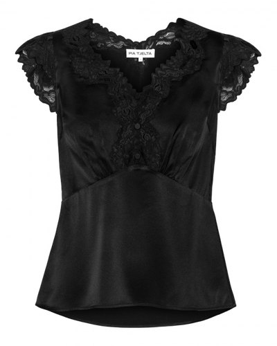 Piazza Top er en bluse i silkesateng med delikate blondedetaljer over byste og langs utringningen. Den lett strukturerte silhuetten og de korte ermene gir et feminint og sofistikert uttrykk. Elegant nok til kveldsbruk, men også enkel å style med jeans eller dressede plagg til hverdags.