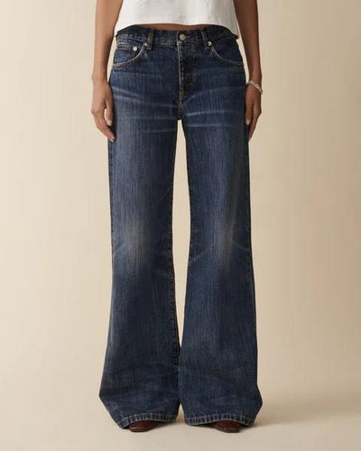 'Kyoto' er en uanstrengt kul, lav midje denim med en løs, utsvingt silhuett. Med glidelåsgylf, lav midje og et bredt ben fra låret som blir enda bredere i bunnen. Laget i stiv blå denim med mer enn 50 % resirkulert innhold, behandlet for en vintage steinvask-look med høye og lave toner. Klassisk tobakksøm.