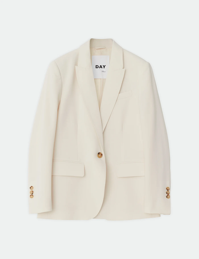 Gabardine blazeren er rett i fasongen, lukkes med knapp i front og har skulderputer.