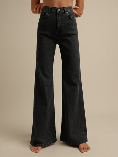 'Fuji' er en ny tolkning av 1970-tallets flare-silhuett med glidelås, høy midje og cascading langstrakte ben. Laget i svart økologisk denim med et slitt og elsket utseende, av Jeanericas karakteristiske stretchmateriale som gir jeansene en varig fleksibilitet.