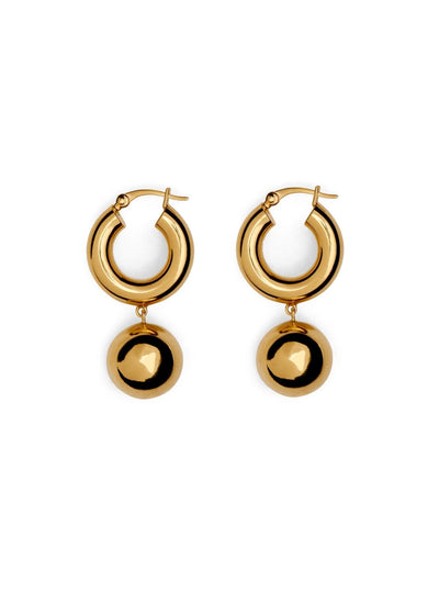 Disse øredobbene er skulpturert av polert 18K gullbelagt sølv med en dinglende ball koblet til bøylen i perfekt størrelse.