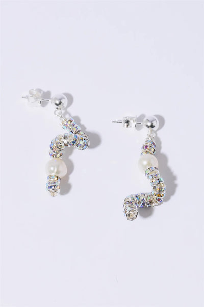 PEARL OCTOPUSS.Y SILVER DIAMOND SNAKE EARRINGS er et par skulpturelle øredobber, med perler og glitrende steiner. De virvlende formene og plasseringen av perler gir øredobbene et organisk og asymmetrisk utseende. Øredobbene er laget med sølvbelagte squardelleperler, asymmetrisk plasserte akrylperler og 925 sølv sterling ørestikker.