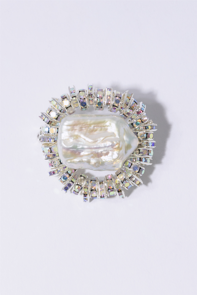 Mini Paris-brosjen er laget av sølvbelagte squaredelle- og rondelle-krystallperler og en firkantet ferskvannsperle. Perlen er organisk og vil derfor være forskjellig på hver brosje, noe som gjør dem alle unike.